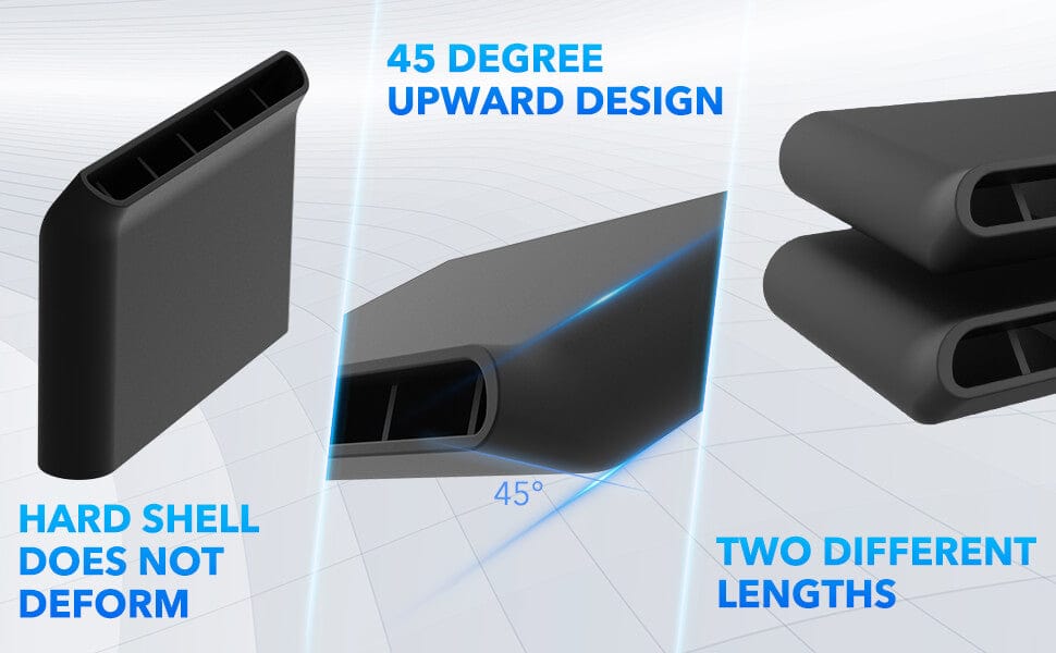 The air outlet of the directional vent deflector made of ABS plastic is designed to be 45° upward to make it durable and directional flow. The two deflectors have different size, the size of the passenger side is 6.6*0.9inch and the driver side is 5.5*0.9inch.